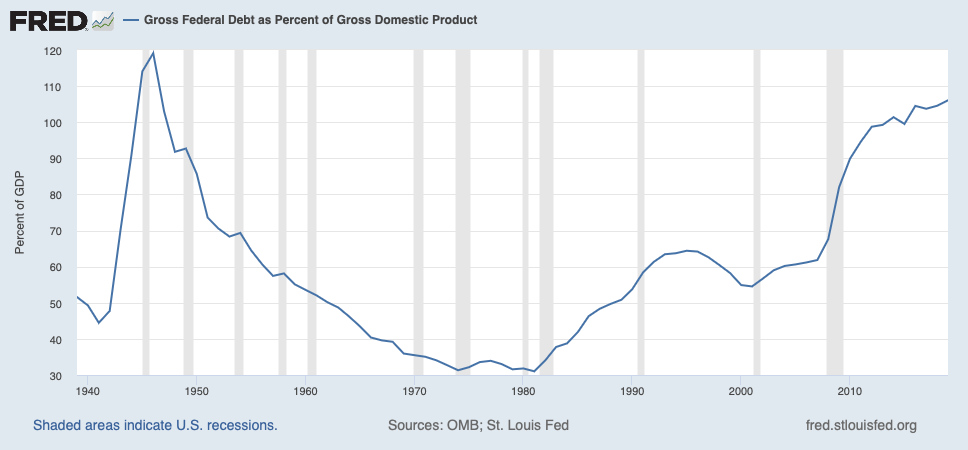 Gross Federal Debt as Percent of Gross Domestic Product. Federal Reserve, downloaded Oct. 19, 2021. fred.stlouisfed.org.