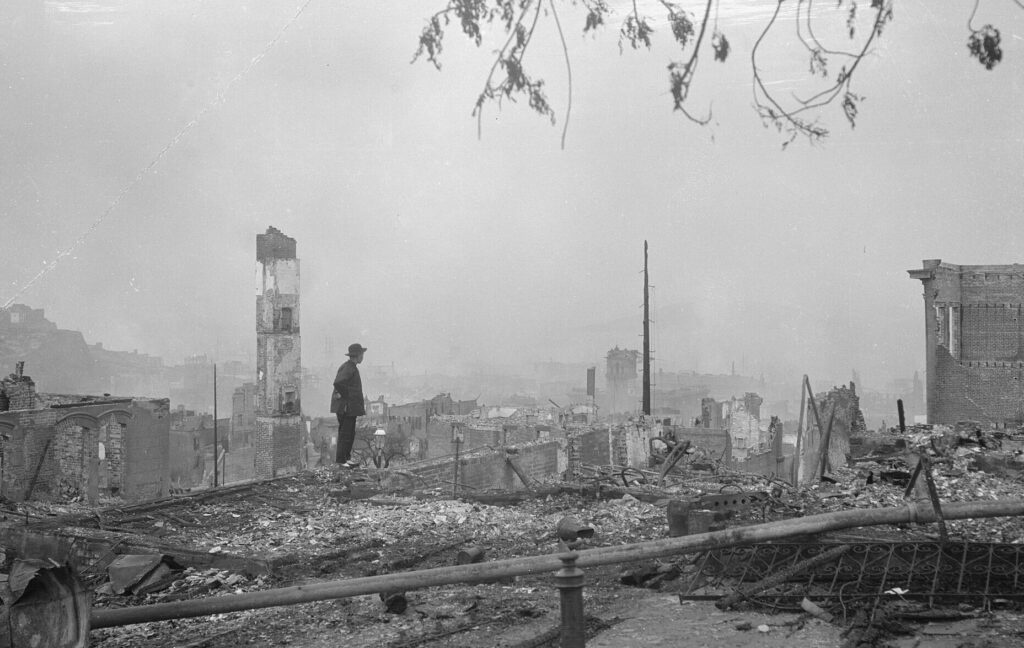 Fires had broken out in San Francisco within hours of the earthquake, due to ruptured gas lines. Since the quake had also ruptured water pipes and destroyed fire stations, flames raged unchecked for four days, until finally extinguished by rain. Buildings left standing after the quake were gutted. Among them was the Fairmont Hotel, which sat high above the city on Nob Hill. When the Fairmont’s owners decided to rebuild, they asked Morgan to head the project. She finished in time for a celebratory reopening in April 1907, and the Fairmont became the social center of the city as it recovered from the disaster.