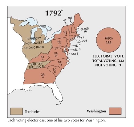Jefferson had a series of conversations and exchanges of letters with Washington from February through October 1792, and kept Madison informed about these. The Republican leaders probably had several motives in these exchanges with the President. If they could not reasonably hope to get him on their side, perhaps they could nevertheless hope to weaken his support for Hamilton. Failing even that, their efforts might at least prevent Washington from turning against them; maintaining Washington’s neutrality and even-handedness towards his quarrelling cabinet officers was worth something. If nothing else, it might goad Hamilton into making mistakes: Hamilton’s ill-thought-out journalistic response to the Republican newspaper campaign against him was probably in part a response to having just received a letter in which Washington had presented to him a long catalogue of the charges that Jefferson was making against him. Finally, there is the fact that Washington was considering retiring (i.e. not being available for re-election). Jefferson sincerely told him that he hoped he would remain as president (as did Hamilton, of course!). If he had retired, the Republicans would have faced the difficult question of whether and how to contest John Adams’ elevation from the vice presidency. All in all, the Republicans had nothing to lose and some possibilities of gain from Jefferson’s maintaining good relations with the President.