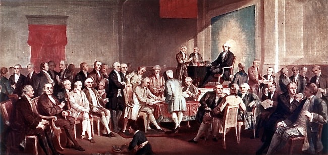 There is one, and only one, table centrally located in the painting, where five delegates gather, busy at work. To their left are eighteen delegates, six sitting in chairs and twelve standing behind them, all looking rather content. To Washington’s right are two delegates, and to his left are thirteen, all seeming to be conversing over the Constitution.