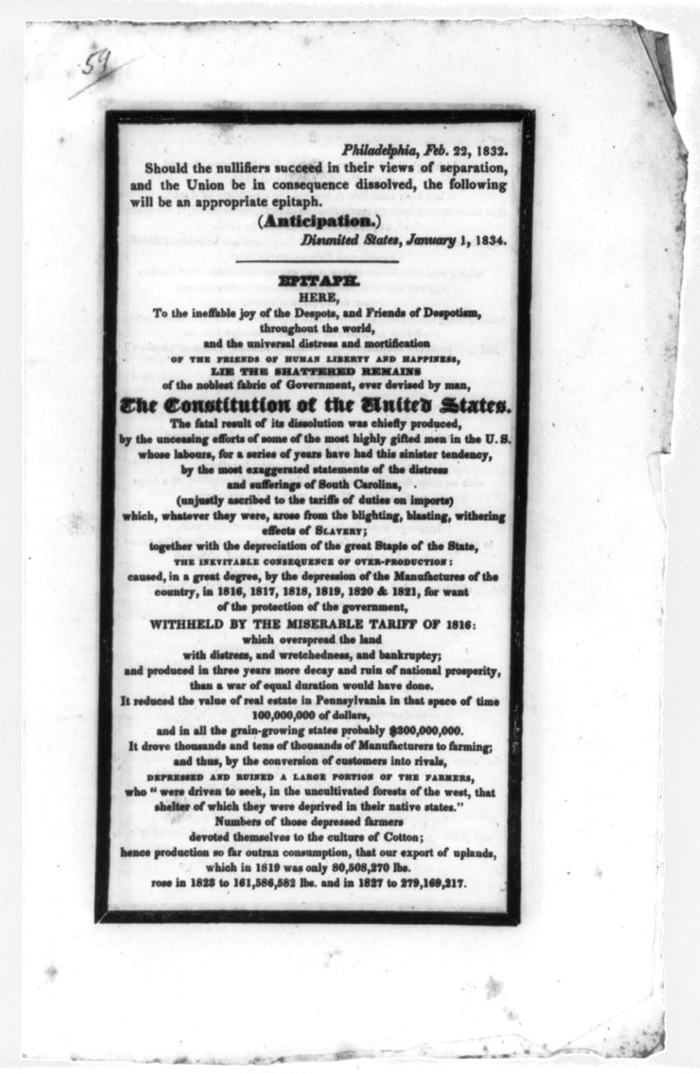 Anonymous, Dissolution of the Union (Philadelphia: 1832), 21-24. Philadelphia Feb. 22, 1832. Should the nullifiers succeed in their views of separation, and the Union be in consequence dissolved, the following
