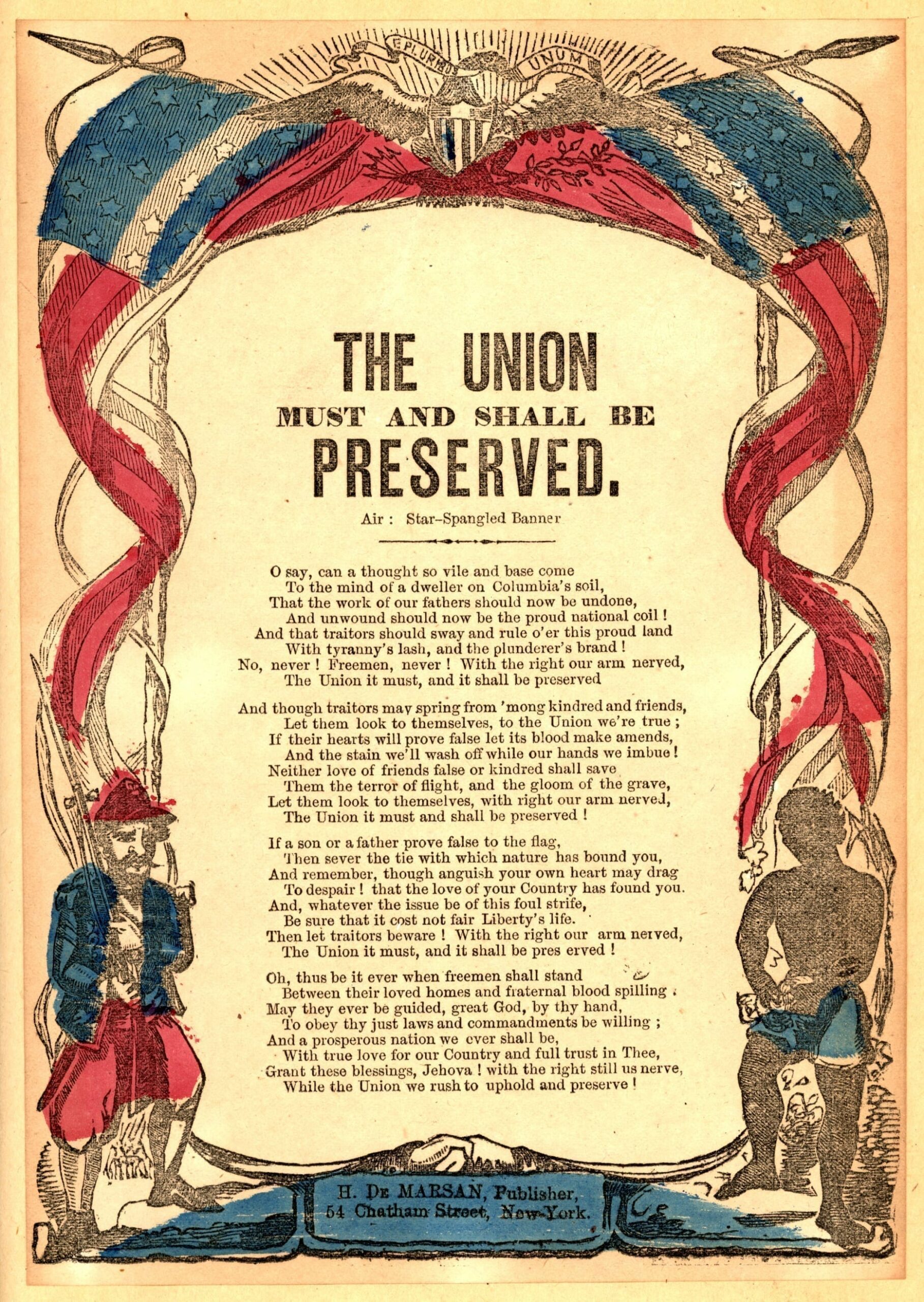 Source: The Union must and shall be preserved. Air.- Star Spangled Banner. H. De Marsan, Publisher, … N. Y. Monographic. Online Text. https://www.loc.gov/item/amss.cw106170/. THE UNION MUST AND SHALL BE PRESERVED,