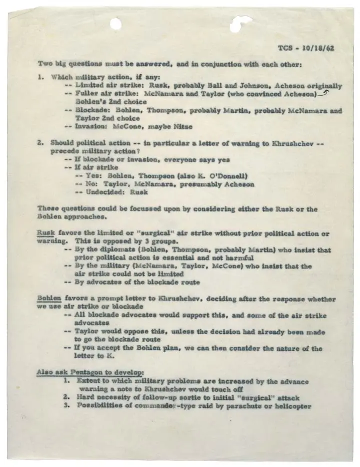 1945–1989 Memorandum for Discussion During the Cuban Missile Crisis The Cuban Situation 1. The establishment of medium range strike capability in Cuba by the Soviets was predicted by me in at least a dozen reports since the Soviet buildup Read More »