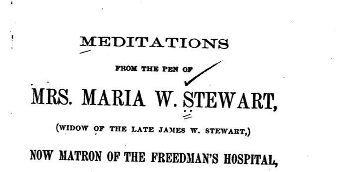 Source: Meditations from the Pen of Mrs. Maria W. Stewart (Washington, D. C., 1879). We have modernized spelling and capitalization. INTRODUCTION This is the land of freedom. The press is