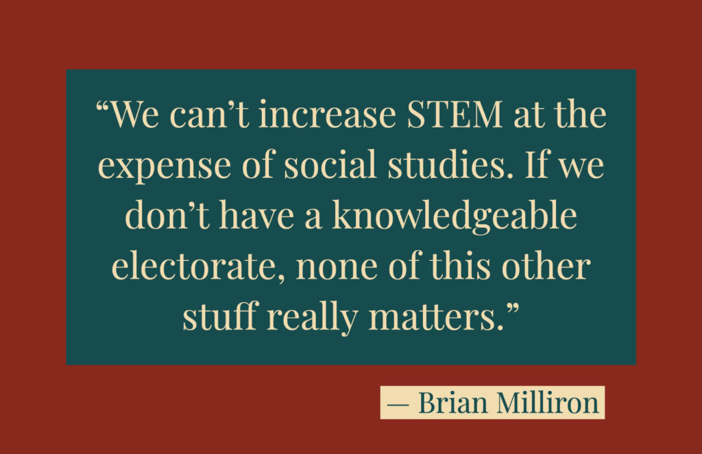 Today, lack of basic knowledge about “how our government is structured, where it came from historically, and why it does what it does” prevents easy conversation about current events, Milliron says. “This is due to schools putting so much emphasis on STEM—education in science, technology, engineering and mathematics. If you increase STEM education, something else has to give, and social studies has lost out consistently.” Policymakers privilege STEM to prepare students for the global economy, “and that’s extremely important,” Milliron says. “But we can’t increase STEM at the expense of social studies. If we don’t have a knowledgeable electorate, none of this other stuff really matters.”