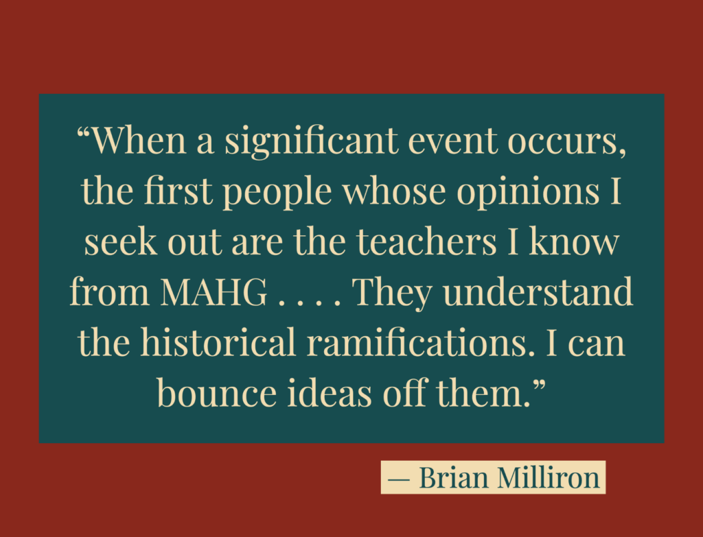 He continues to learn through the network of friends he built in MAHG and through the Madison program. “When a significant event occurs, the first people whose opinions I seek out are the teachers I know from MAHG and from Georgetown. They’re following events closely. They understand the historical ramifications. I can bounce ideas off them. I don’t know any teacher who found the 2020 election cycle reassuring. But I was glad I could talk with people who could compare it to other contentious elections.” Last summer, Milliron took Professor John Moser’s class on the 1968 election, reading documents from the 1968 Democratic Party Convention and playing a “Reacting to the Past” game in which each teacher represented one of the clashing constituents at the convention. “It was fantastic,” Milliron said; it will help him during elections of the future, given that political polarization shows little sign of diminishing.