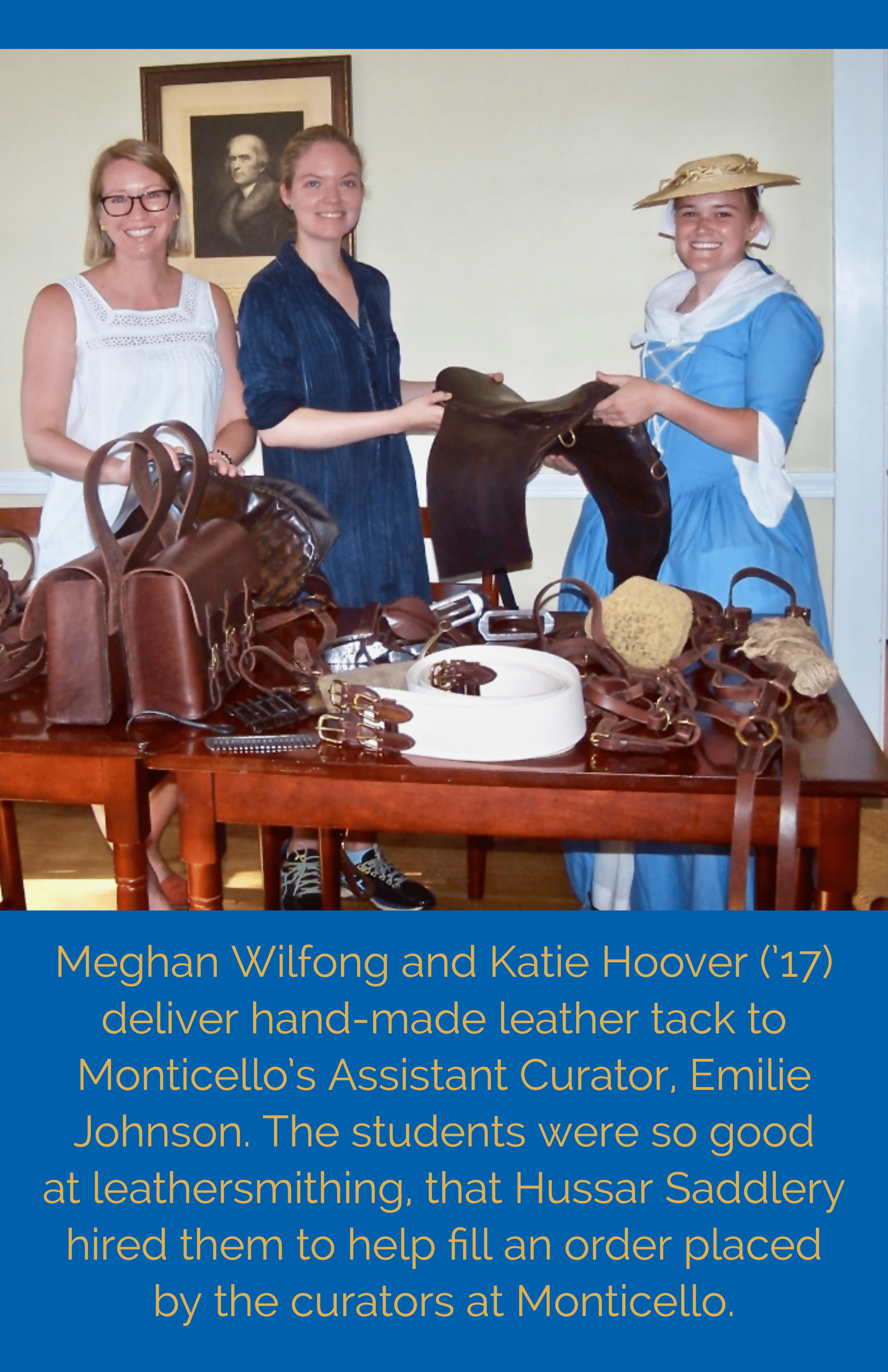 Wearing their finished outfits, students collaborate with historical reenactors to stage two weeks of “Frontier Days.” Visitors watch them construct a log cabin, cook over open fires, play native American games, and shoot muzzle-loaded flintlock guns. Those who’ve mentored the students admire the results. “Two students were offered internships at Monticello because of their beautiful leather work,” McDougall said proudly.