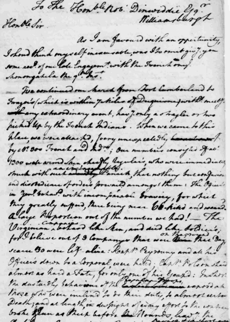 One of my favorite primary sources in American history is a letter I present to students without revealing the author. I tell them it was written to Virginia’s colonial governor, Robert Dinwiddie, after the Battle of Monongahela. But I don’t tell them it was written by 33-year-old Colonel George Washington, commander of the Virginia regiment. Washington reports a debacle: most of the officers are dead; the troops retreated under fire; he had two horses shot out from under him. (It’s amazing that he did not die himself.) I ask students to unpack that document. It’s written in Washington’s own kind of shorthand, and the version we read is directly transliterated from the original—you can see his edits, where he struck out phrases and then wrote something else. Sometimes students say, “This guy can’t spell!”