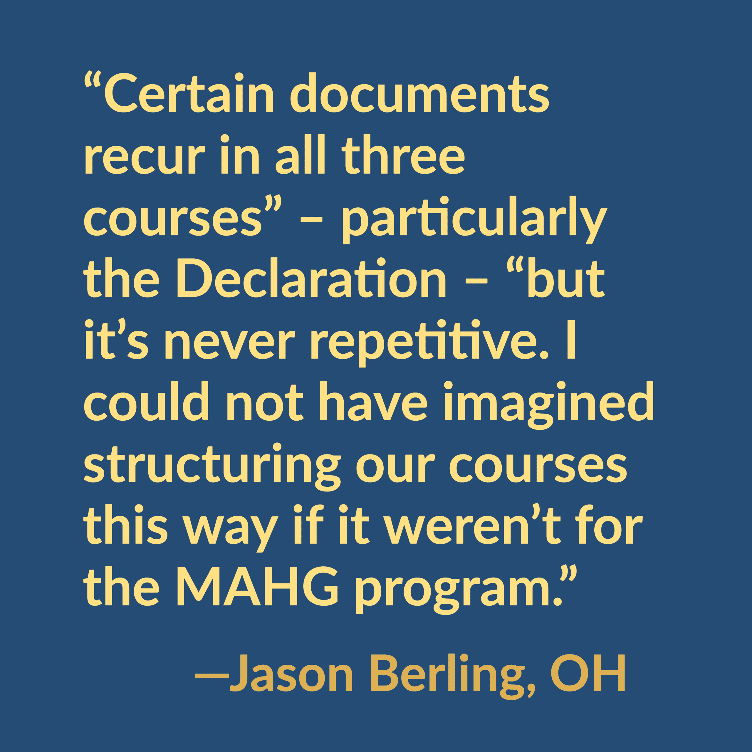 At Seton, freshmen study world history, sophomores study US government, and juniors study US history. “Certain documents recur in all three courses”—particularly the Declaration. “They first study the Declaration as an example of enlightenment thinking in the Age of Revolutions. In sophomore year, they study its implications for the structure of our government. When it comes up again in US history, we look at it as an historical document. What events led to it and what happened as a result of it? Does the argument in the list of grievances hold up to historical scrutiny?” Students also compare the Declaration to other historical sources. Freshman look at other declarations of independence, such as that of Haiti. Sophomores may compare it to John Adams’ “Thoughts on Government.” Juniors read primary sources revealing the public attitudes that supported the Declaration. “In all of these cases, they’re reading the same document, but it’s never repetitive. I could not have imagined structuring our courses this way if it weren’t for the MAHG program.”