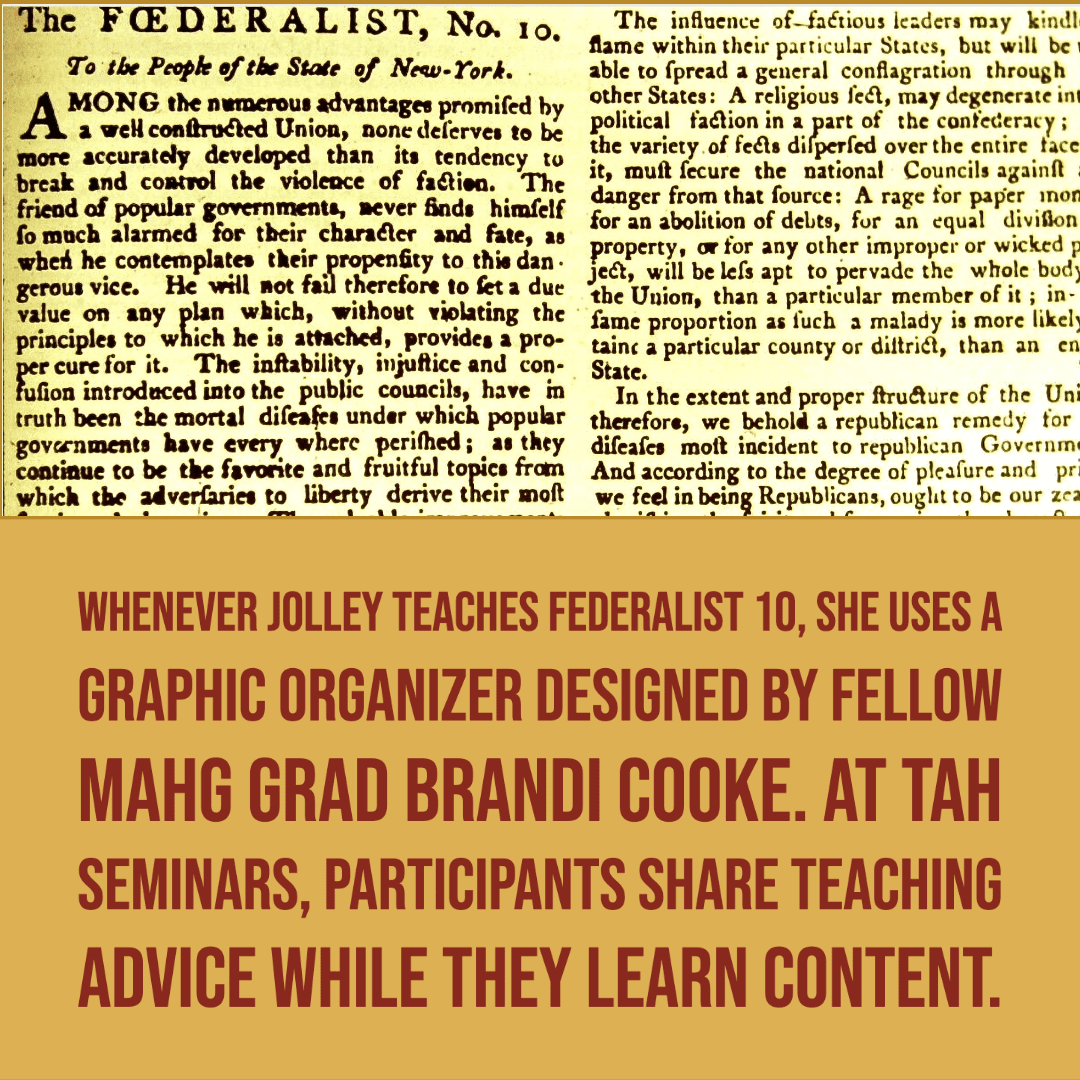 Jolley noted that whenever she teaches Federalist 10, she uses a tool designed by fellow MAHG graduate Brandi Cook—a visual organizer that traces Madison’s complex logic. When she took the course on The Federalist with Professor David Foster, he shared Cook’s graphic with the whole class. “This is gold!” teachers said. TAH seminars aim to give teachers content knowledge, not teaching advice. Yet participants share teaching advice while they learn content.