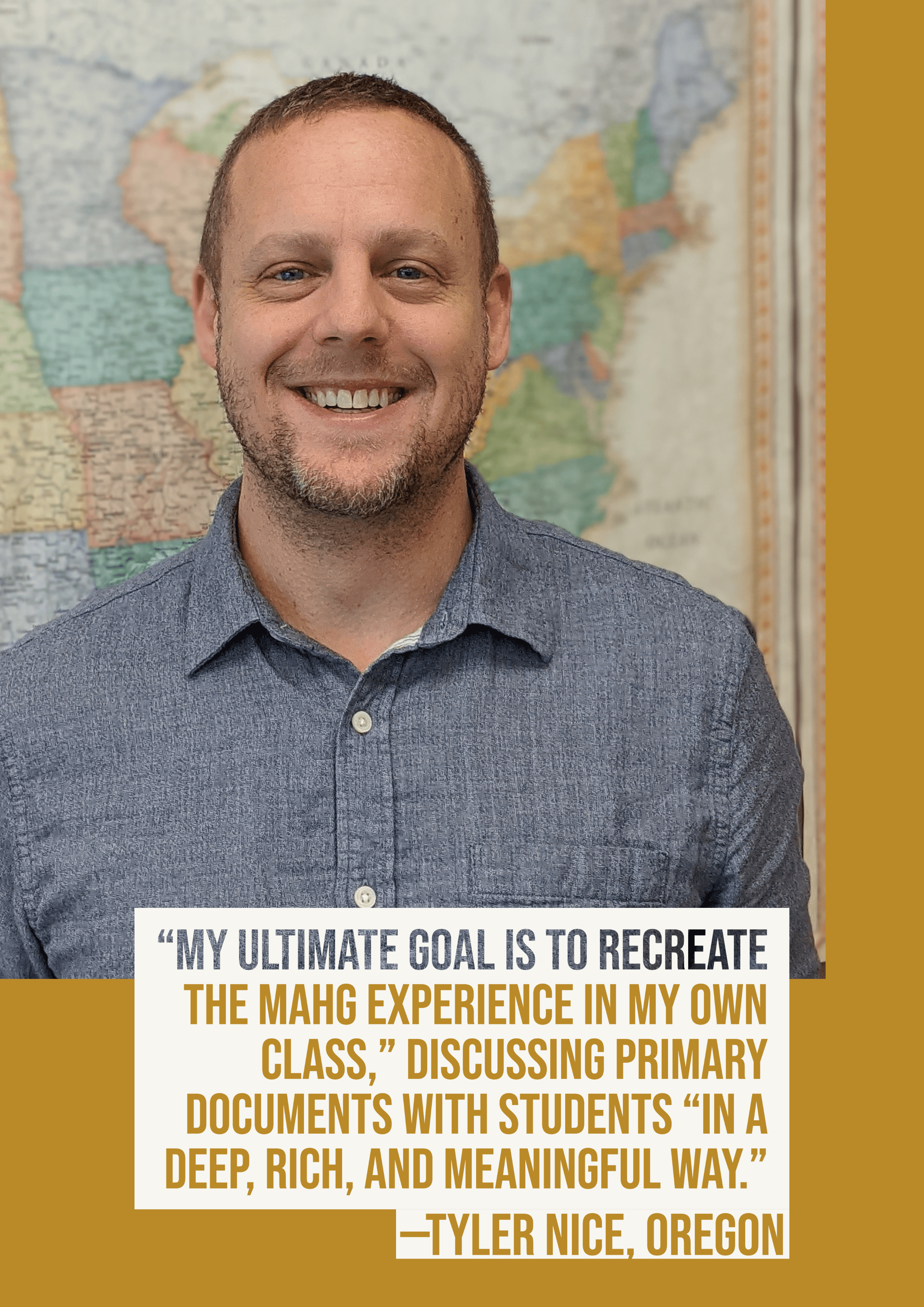 Nice hopes to soon begin teaching courses that will afford more time for both primary documents and literature. The MAHG degree, which Nice will complete next summer, will qualify him to teach in Oregon’s dual enrollment program. While APUSH and AP Government race students through everything that might appear on the high-stakes final exam, dual enrollment courses allow time to foster critical thought through text analysis. “My ultimate goal is to recreate the MAHG experience in my own class. I want kids to read primary sources and then come together to discuss them in a deep, rich, and meaningful way.”