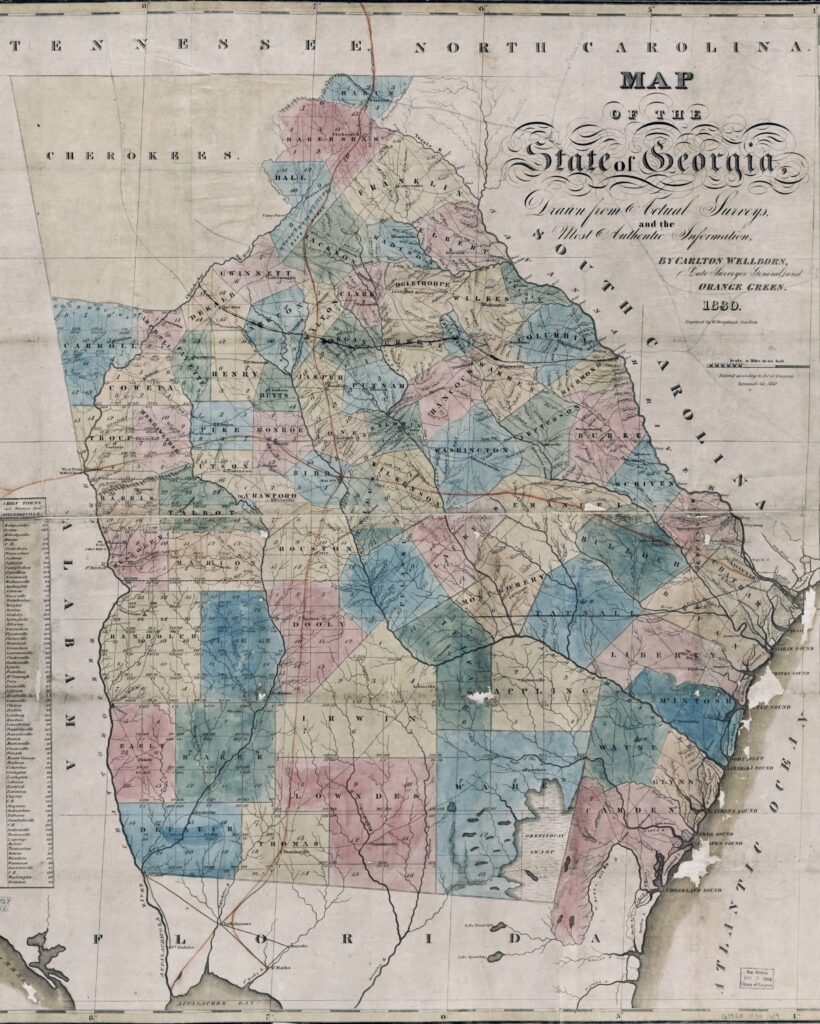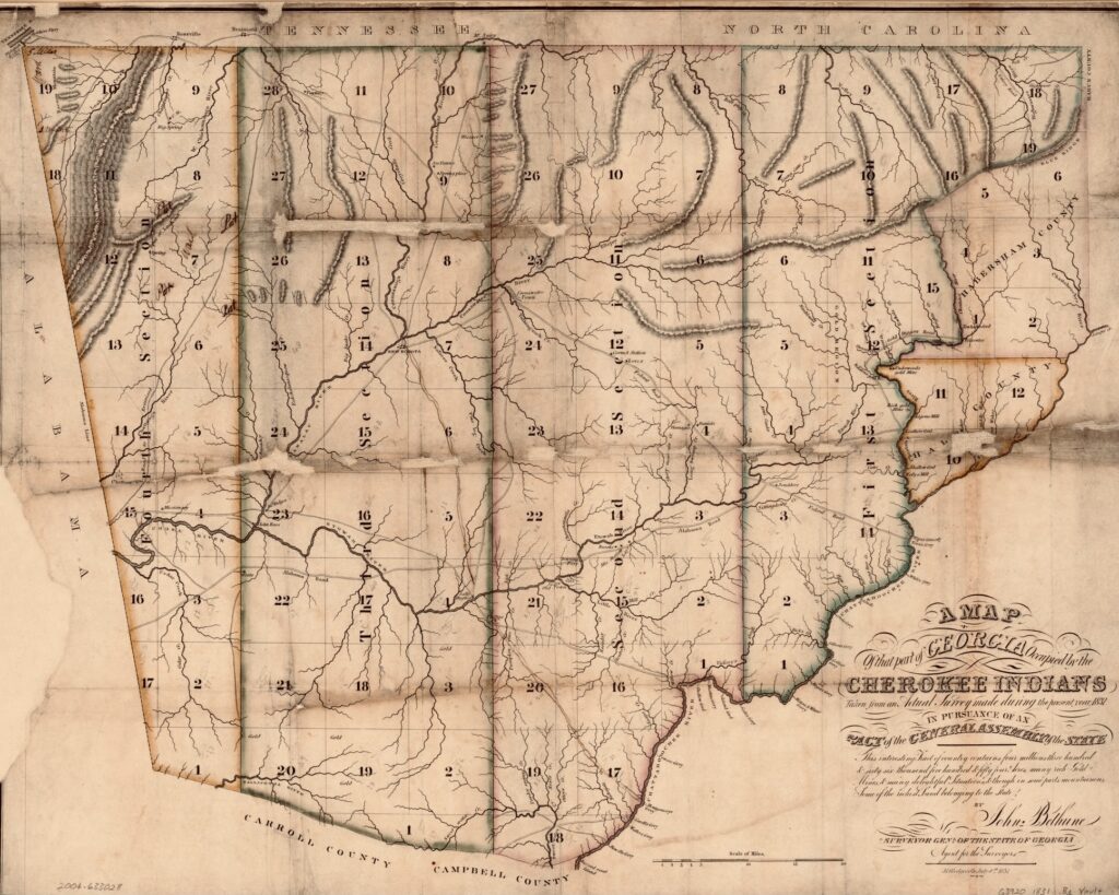 By the time of Chief Ross’s address, the Cherokee had ratified their national constitution, established their National Council, courts, and election system, and were publishing the bilingual Cherokee Phoenix newspaper due to the efforts of Sequoyah (a.k.a George Gist, c.1776 – 1843), the self-taught Cherokee linguist who developed the Cherokee syllabary. While asserting that they were a sovereign nation within the United States, the Cherokee had taken steps towards acculturation. Land grabs, such as those in the 1792 Treaty of Holston, had diminished the range of the Cherokee lands, but the biggest threat to Cherokee sovereignty was the 1828 discovery of gold in northwest Georgia’s mountains. Citizens of Georgia sought to take this land from the Cherokee so they could reap the benefits of America’s first gold rush. By 1832, the state of Georgia set up a land lottery to parcel out Cherokee lands to white Georgians. The whites would assume ownership of those lands once the Cherokees were forced westward.